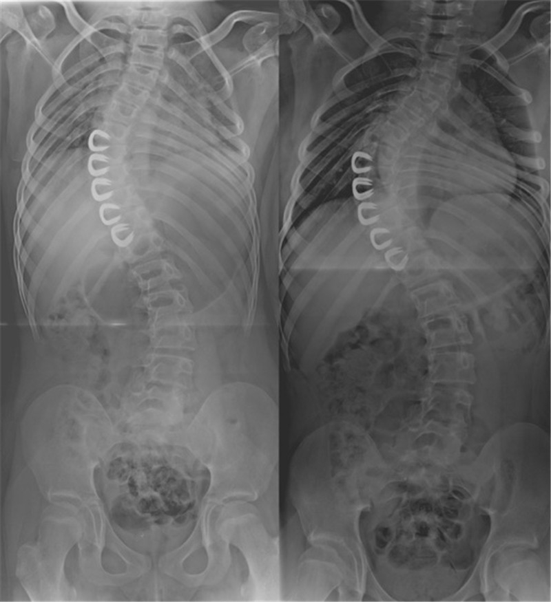 图3 6岁EOIS患儿,术前冠状面全脊柱正位X片(左),采用双生长棒技术,两端固定,顶椎撑开,术后6月复查正位X片(右)