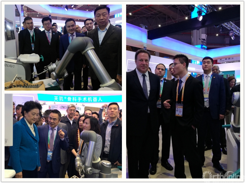 天玑®骨科手术机器人的展台吸引了国内外众多人士的关注,除了开展首日习近平总书记带领多国元首的国家馆巡馆以外,在参展期间国家副总理、原国家副主席,原国务院副总理,商务部外贸发展事务局局长,上海市委常委、宣传部长,中国铁建监事会监事,巴拿马共和国总统,卢森堡副首相,菲律宾贸工部长,古巴总统,尼日利亚贸易工业投资部长,通用集团负责人等纷纷来到展台参观交流,对天玑®表现出浓厚的兴趣。