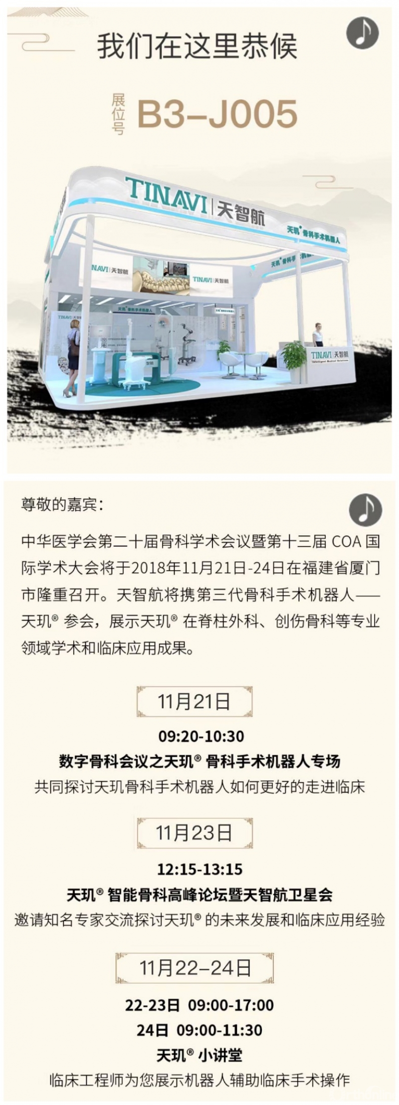 在下周的2018厦门COA会议中,天玑骨科手术机器人也将以多种形式让大家亲临了解并探讨手术机器人在临床中应用的种种,而且现场展出的机器人是从上海运来的这台习大大亲自点赞过的机器,大家可以来我们的展台亲自操作。