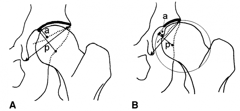 研究人员对骨盆正位平片,测量p(髋臼关节面至后壁的距离)、a(髋臼关节面至前壁的距离),计算p/a值, p、a均在根据泪滴低点至髋臼外侧缘连线的垂直平分线上。他们共 对185例怀疑股骨头坏死的患者进行了测量,并与髋臼后倾的定量指标进行对比。再使用62例无关节炎患者CT,测量其股骨头中部平面处的解剖前倾角,并与p/a比值对比。
