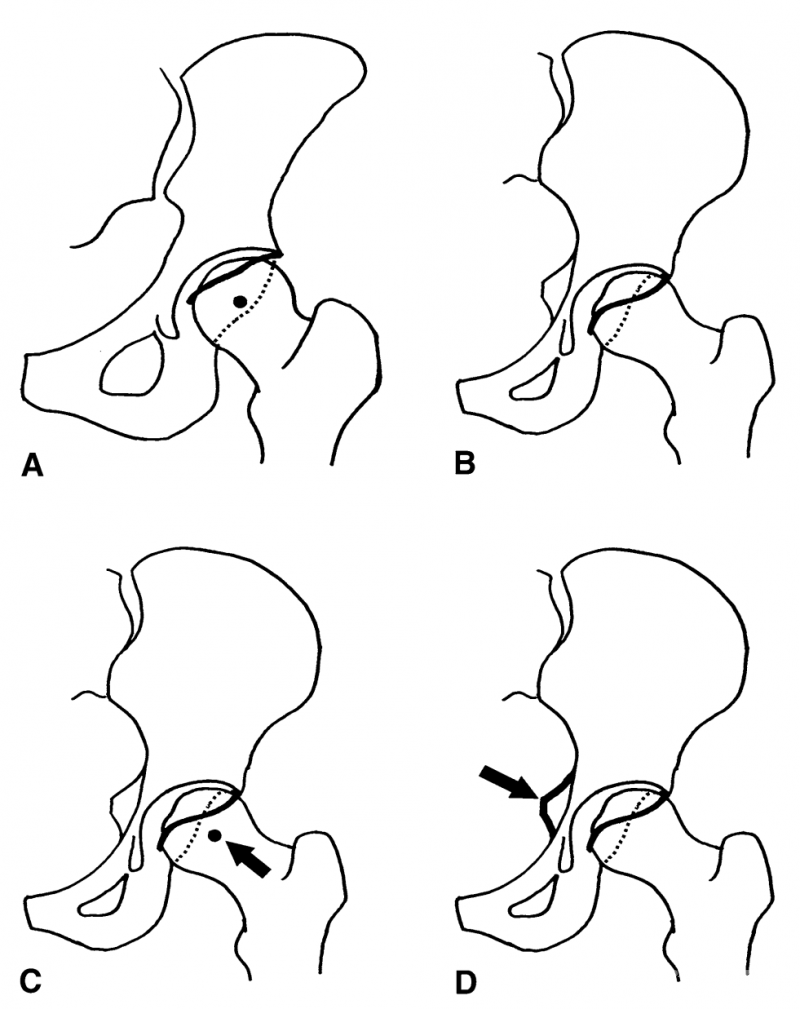 图2A-D(A)正常髋关节。(B)当髋臼前壁轮廓在髋臼后壁的外侧时,为COS阳性。(C)当髋臼后壁边缘在股骨头中心内侧时,PWS为阳性。(D)PRISS征关注坐骨棘是否突入骨盆内,突入则为髋臼后倾。
