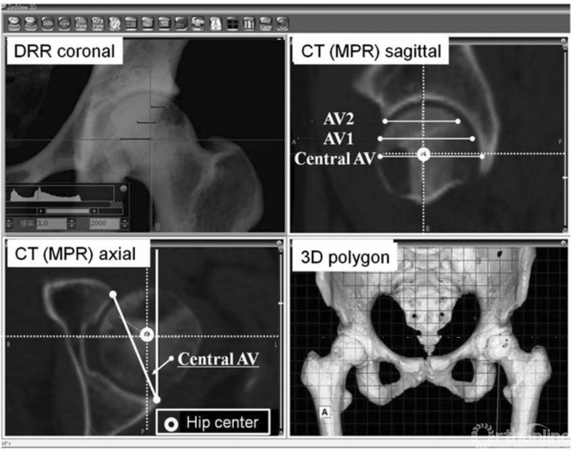 图3:Zed髋关节软件能重建3-D模型,并显示多平面重建(MPR)、数字X线片(DRR)影像,以替代普通平片。在3个垂直于TTP的横截面测量髋臼前倾角:中心前倾角((AV), AV1, AV2),使用DRR,在TPP代表的冠状面上测量p/a比值。