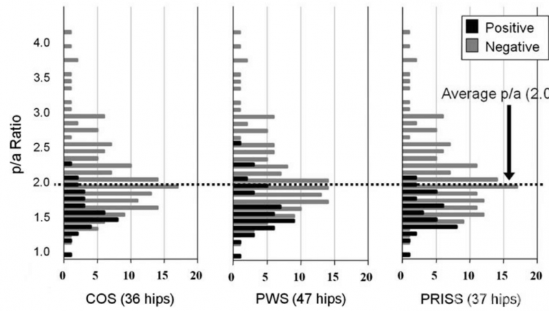 图4:示后倾征分布率,后倾征阳性的髋关节p/a比值很少超过2.05(p<0.001)(185例髋的平均值)。但对于p/a比值小于2.05的髋关节,其后倾征阳性及阴性混杂。