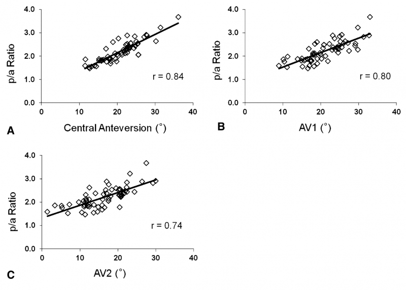 图5A-C:p/a比值与(A) 中心前倾角AV, (B)AV1, (C) AV2的关系。p/a比值与此3个前倾角值均相关(中心前倾角AV: r = 0.84, p<0.001; AV1: r = 0.80, p<0.001; AV2: r = 0.74, p <0.001)。回归分析显示p/a比值与中心前倾角AV存在以下关系:中心前倾角AV=9.6Xp/a –0.3°。