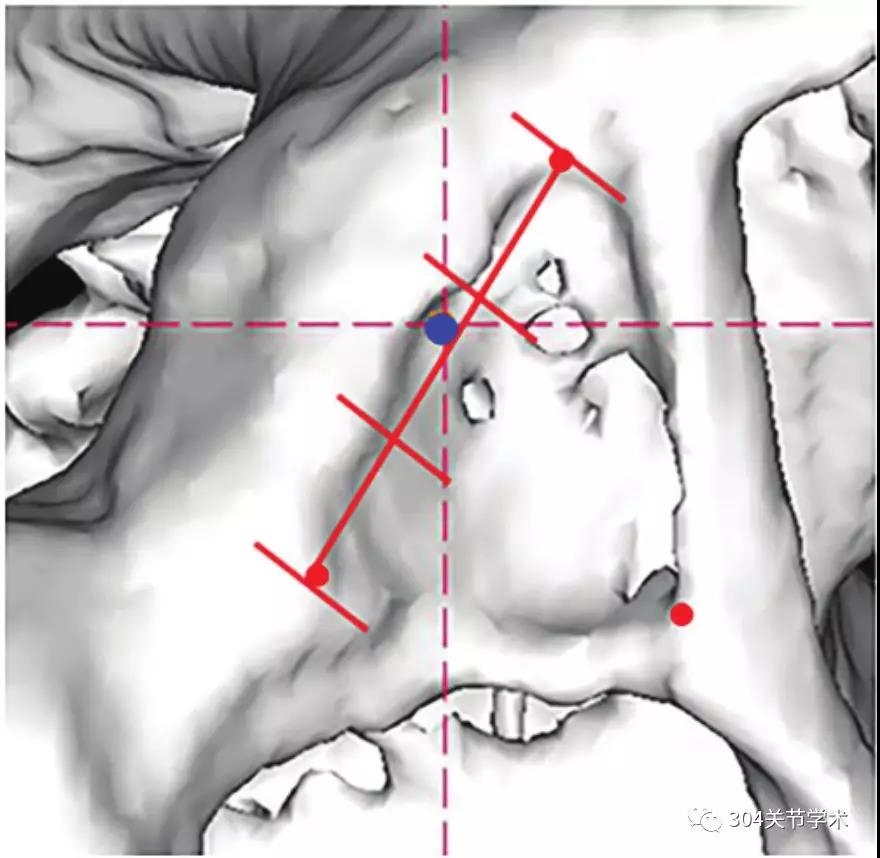 黑色箭头指示真臼位置,蓝色箭头指示髋臼杯中心点