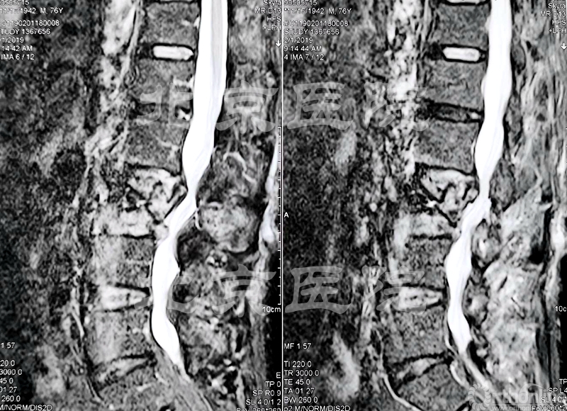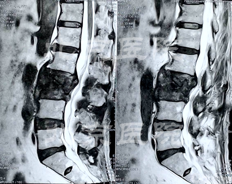 患者为76岁男性,腰痛多年加重一月伴有腿疼,多年前曾有腰部外伤史,由于资料缺失原因不详。患者患有类风湿关节炎多年,需要常年使用激素治疗;伴有腰椎间盘突出症病史20多年,偶尔发作,合并有重度骨质疏松症;腰部BMD:-3.9(0.162g/cm2).