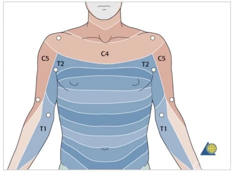 注意C4/5的皮节支配区和T1/2皮节区相邻,C4/5损伤可能出现肩胸部浅感觉减退的向下覆盖表现。