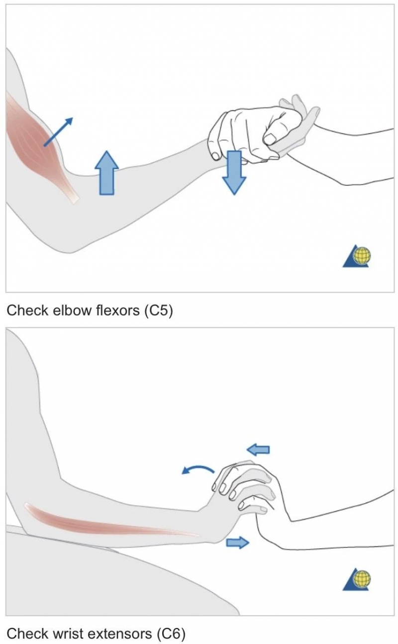 C5屈肘,肱二头肌;C6伸腕,腕伸肌