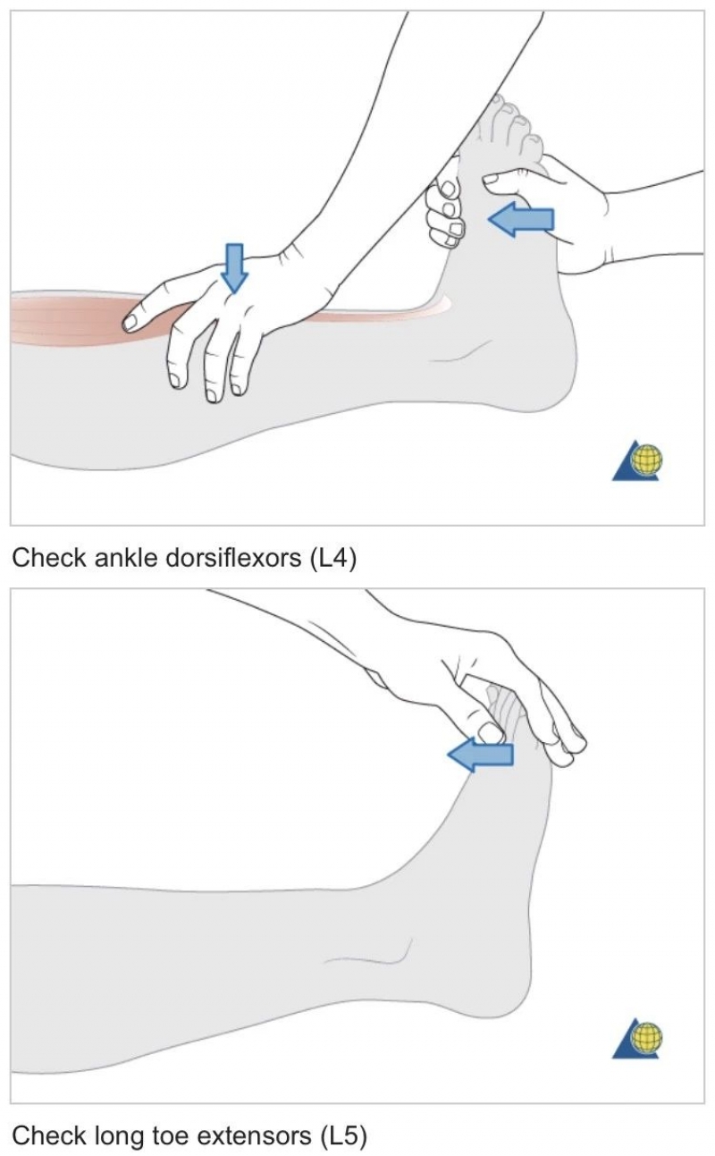 L4踝背伸,胫骨前肌;L5趾背伸,趾长伸肌