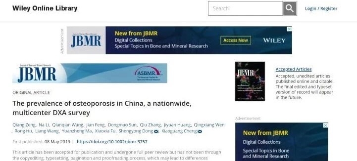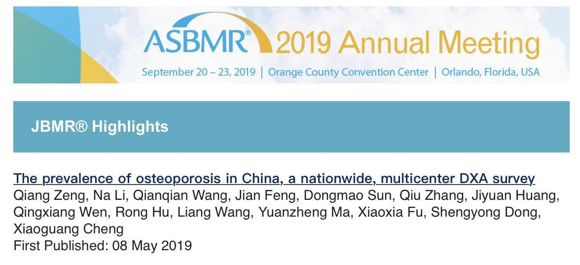 近日,北京积水潭医院放射科程晓光教授团队和中华医学会健康管理学分会主任委员、中国人民解放军总医院健康管理研究院曾强教授团队领衔主持的一项多中心DXA骨密度研究结果发表于国际骨矿盐研究领域最具影响力的JBMR(Journal of Bone and Mineral Research)杂志,该研究还被美国骨质疏松与骨矿盐协会ASBMR(The American Society for Bone and Mineral Research)作为亮点研究重点推荐。曾强教授,北京积水潭医院李娜、王倩倩为文章共同第一作者,程晓光教授和中国人民解放军总医院董剩勇博士为共同通讯作者。