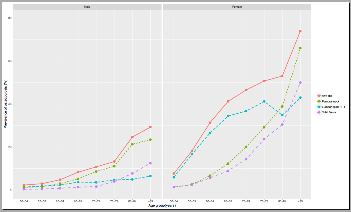 该研究选取全中国范围内有地域代表性的7家三甲医院2008-2018年采集的75,321例20岁以上健康体检人群,其中男性男性40,944人(54.36%),女性34,377人(45.64%);总体年龄(51.8±10.9)岁。研究采用同一品牌的双能X线骨密度仪(DXA)扫描仪测量腰椎和髋关节骨密度,经同一欧洲脊椎体模(ESP编号 145)严格质控并校正骨密度值,所以的骨密度值都统一到一个标准化的骨密度。该项目提供了我国正常人群的DXA峰值骨量,和骨密度与年龄变化规律。根据中华医学会骨质疏松与骨矿盐疾病分会指南推荐的标准,根据中国人群自己的正常参考值,计算得出T值。根据DXA骨质疏松症诊断标准,得出我国50岁以上人群男性和女性年龄标准化骨质疏松症患病率分别为6.46%和29.13%,按照2010年全国人口普查数据,现有骨质疏松症患者男性约1080万,女性约49,29万人。该调查结果显示我国骨质疏松症患病率处于中等流行水平,对我国的骨质疏松症防治具有重要意义。