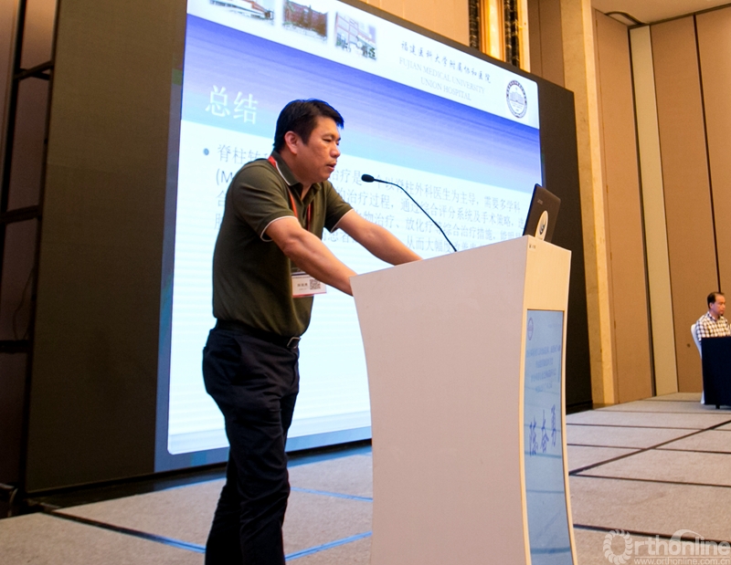 大会主席,福建医科大学附属协和医院刘文革教授作了题为“脊髓损伤治疗现状及展望”专题讲座,深入浅出地介绍了脊髓损伤的病因以及进展过程,并说明了当前治疗脊髓损伤的各种方式,展现了福建协和骨科团队优秀的临床与科研能力,受到与会专家的高度认可。福建医科大学附属协和医院陈奋勇教授作了“脊柱转移瘤的手术重建策略”专题讲座,为我们详尽介绍了脊柱转移瘤的分期和分级方式,并强调了脊柱转移瘤治疗中多学科(MDT)参与的重要性。