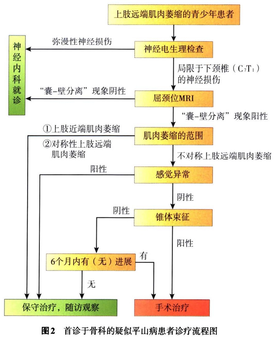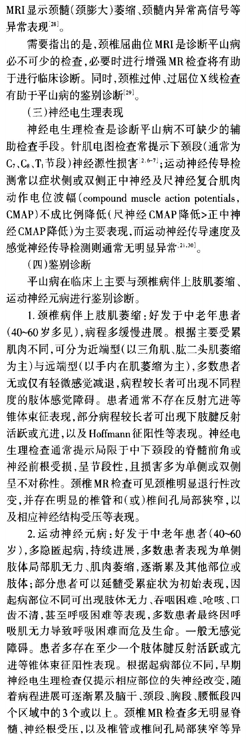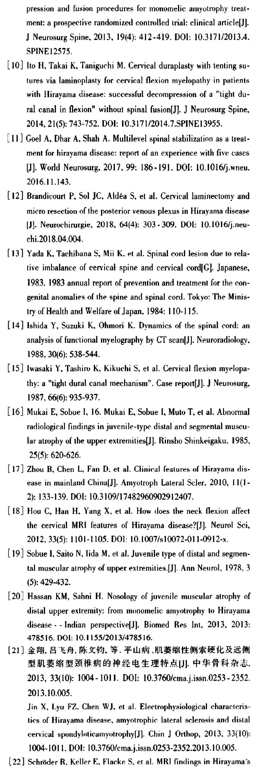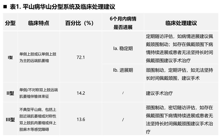 表1 平山病华山分型系统及临床处理建议(王洪立, 郑超君, 金翔, 等. 平山病华山诊断标准与临床分型[J].中华骨科杂志,2019,39(8):458-465. DOI: 10.3760/cma.j.issn.0253⁃2352.2019.08.003)