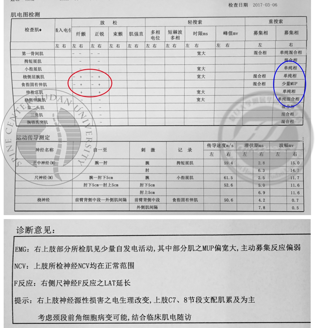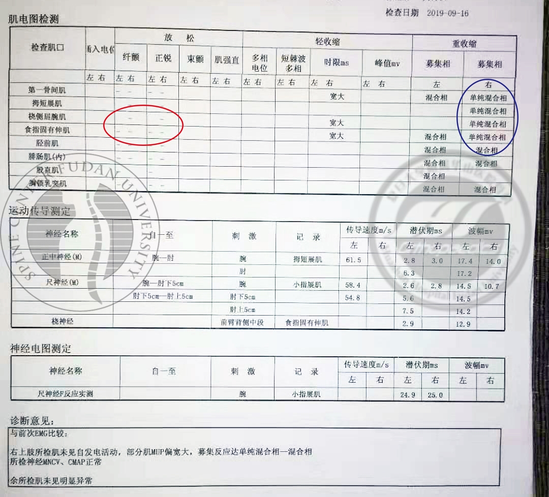 图8 患者2019年9月神经电生理检查报告,其中红圈示被检肌自发电位消失,蓝圈示桡侧屈腕肌、食指固有伸肌募集情况由“单纯相”“少量MUP”恢复为“单纯混合相”