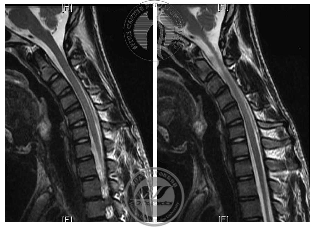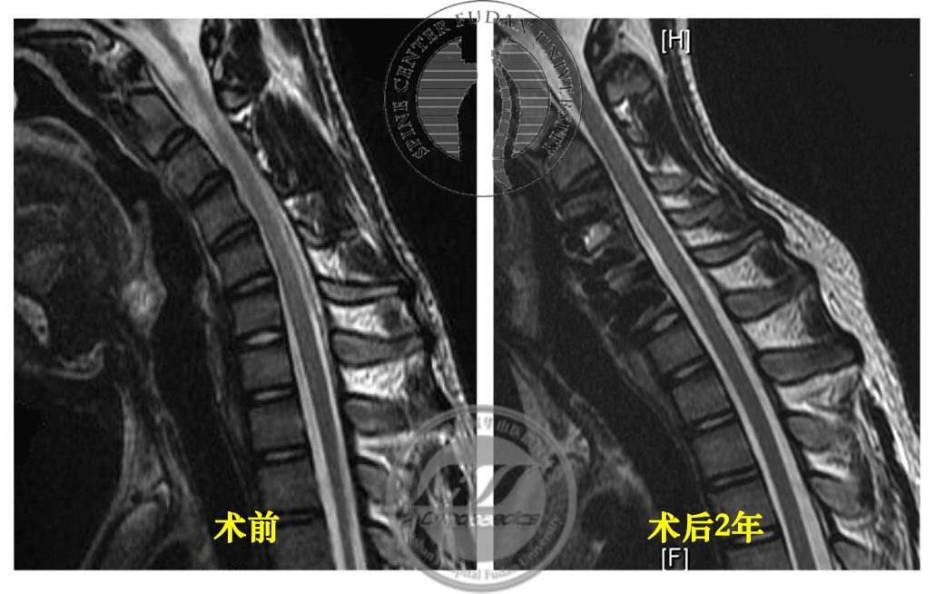 图7 术前与术后2年屈颈位MRI对比,术后T2加权像显示“膜-壁分离”现象消失