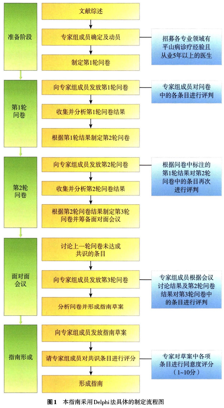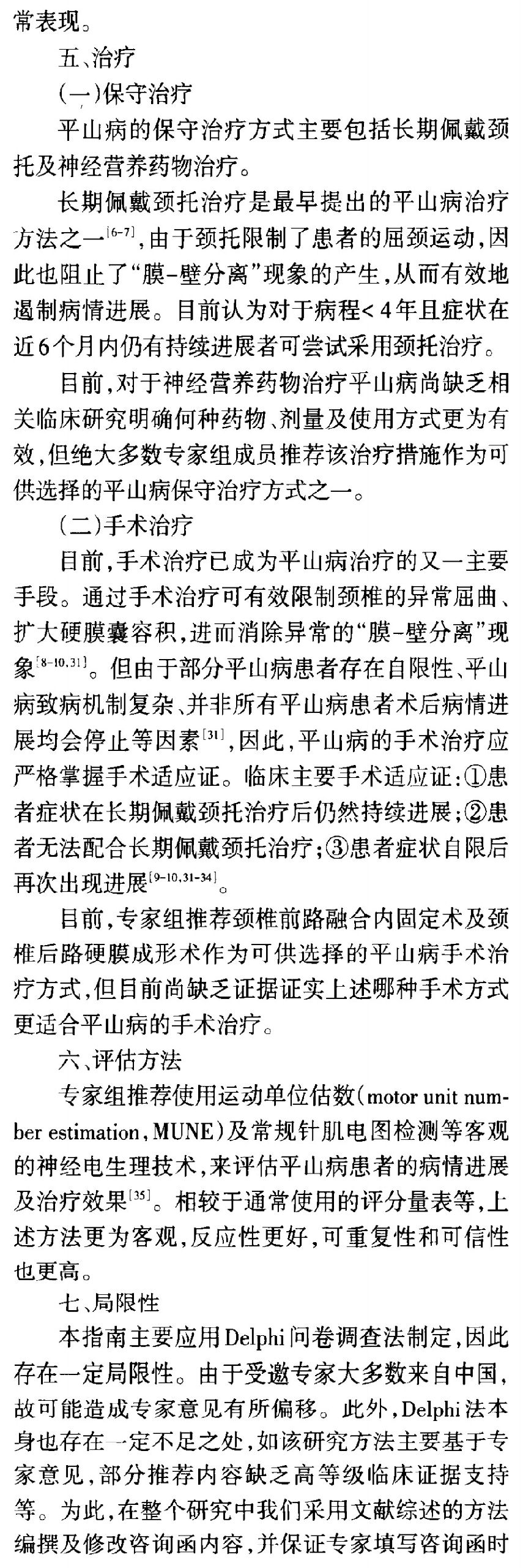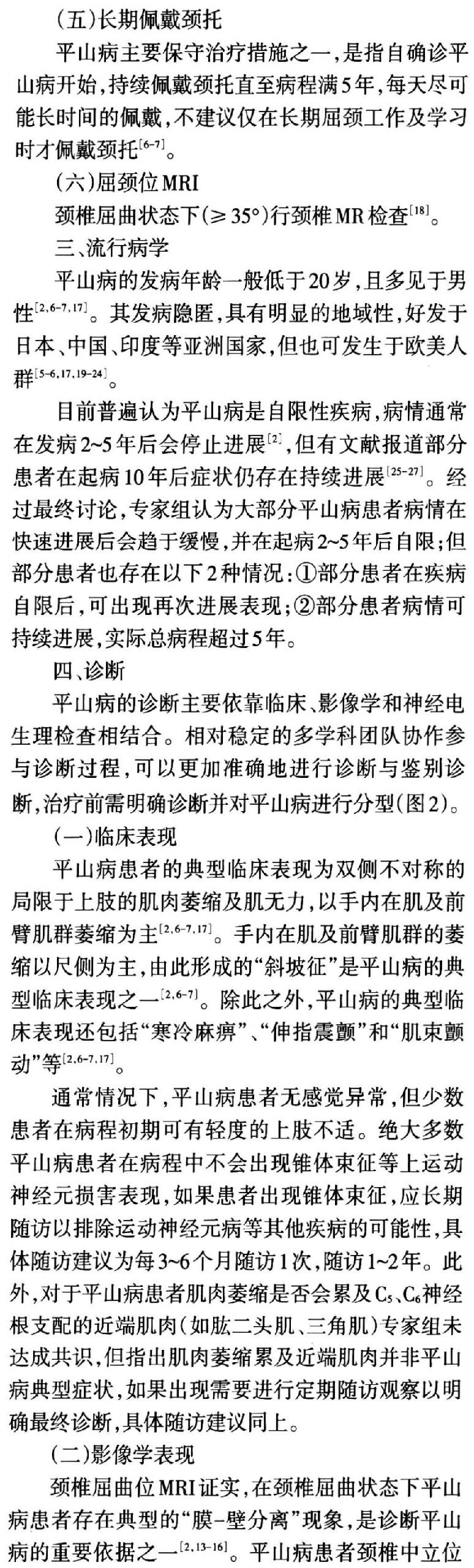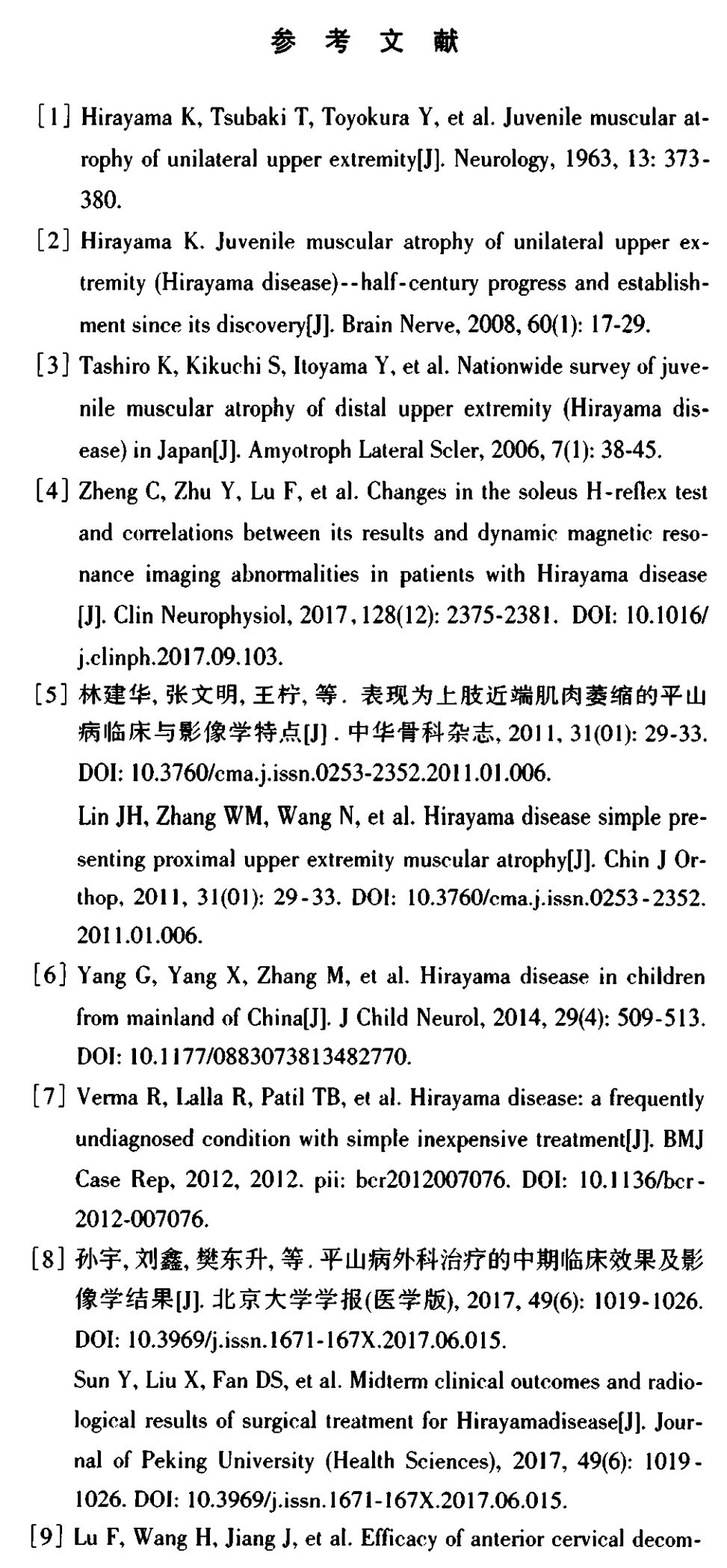为了进一步规范平山病的诊疗流程,促进平山病的早期诊断及有效治疗,2018年4月由复旦大学附属华山医院骨科牵头组织了全世界6个国家(中国、美国、日本、印度、意大利、西班牙)、7个专业领域(脊柱外科、神经内科、神经外科、手外科、康复科、放射科、神经电生理中心)的47位专家遵循科学性、实用性和先进性原则,采用 Delphi 法共同讨论制定了平山病临床诊疗规范国际指南,从临床表现、影像学及电生理特征、诊断与鉴别诊断、保守与手术治疗、疗效评价等多个方面对平山病进行了规范总结(文末附指南原文)。