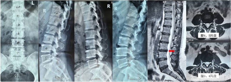 图1:术前X线提示腰椎轻度退变,动力位未见腰椎不稳表现;腰椎MRI提示腰3/4节段呈“黑间盘”,并可见HIZ表现(箭头所示)