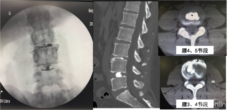 图2:椎间盘造影及CT可见腰4/5节段(右上)造影剂分部局限,无渗漏迹象,术中未诱发出疼痛;腰3/4节段(右下)造影剂外渗,并可诱发出明显疼痛