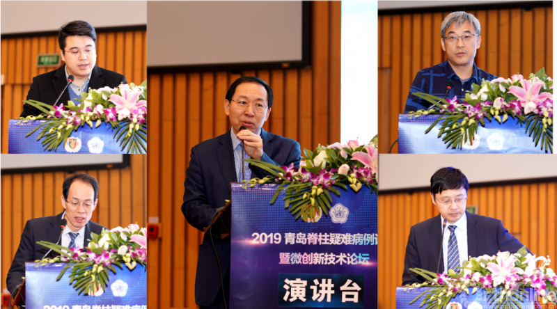 来自山东省内多位脊柱外科专家纷纷与在座的脊柱外科同道分享各自的疑难病例,大家互相学习,深入交流,将论坛学术氛围推向高潮。他们分别是:山东大学齐鲁医院程雷教授(中)、青岛市市立医院林勇团队金沧海教授(左上)、青岛大学附属医院张国庆教授(左下)、青岛大学附属医院郑修军教授(右上)、青岛大学附属医院王亭教授(右下)。