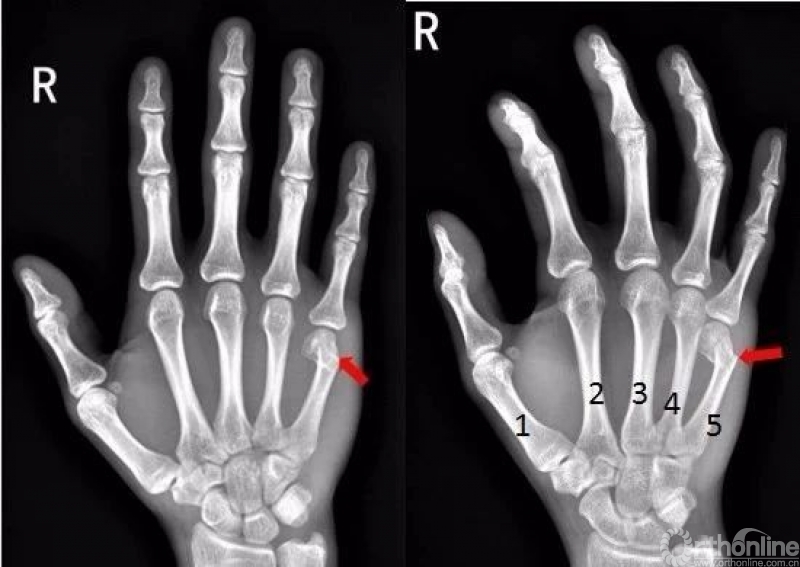 右手第五掌骨远端骨皮质不连续,骨折端移位、成角。右手第五掌骨骨折(1-5. 第1-5掌骨)