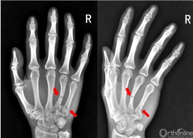 右手第四掌骨中段、第五掌骨基底部见横行骨折透亮线,骨折端对位对线尚可。第四、第五掌骨骨折
