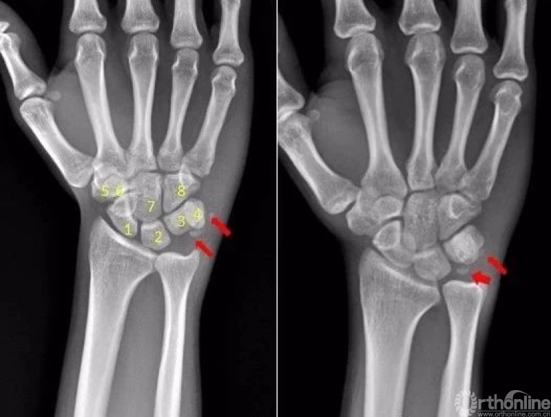1.舟骨 2.月骨 3.三角骨 4.豌豆骨 5.大多角骨 6.小多角骨 7.头状骨 8.钩骨