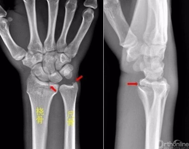 右侧桡骨远端可见不规则透亮骨折线,并累及关节面。右侧桡骨远端骨折