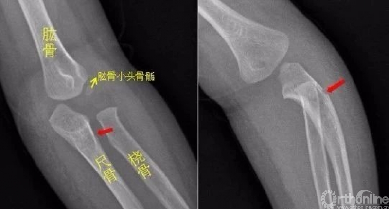 左侧尺骨上段见骨折透亮线,断端稍移位成角。左侧尺骨上段青枝骨折