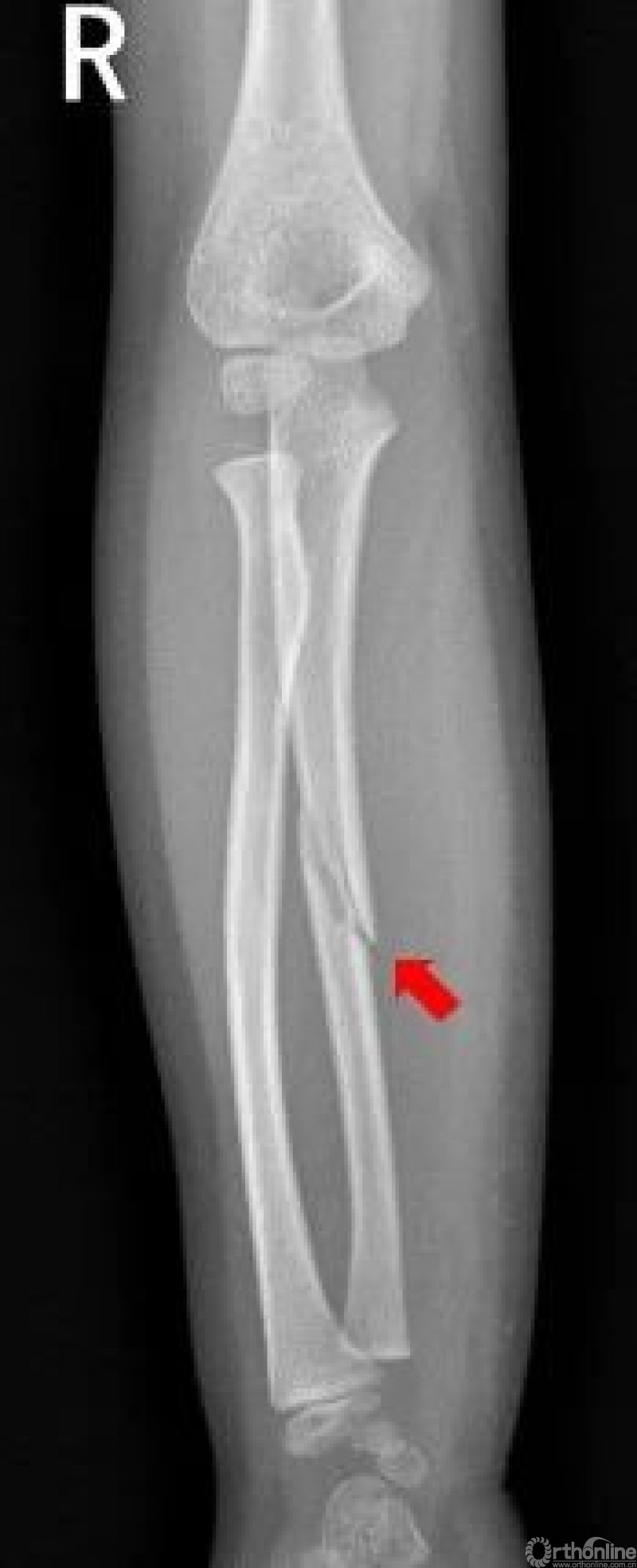 右侧尺骨中段可见斜形骨折线,骨折端稍分离移位。右侧尺骨中段骨折