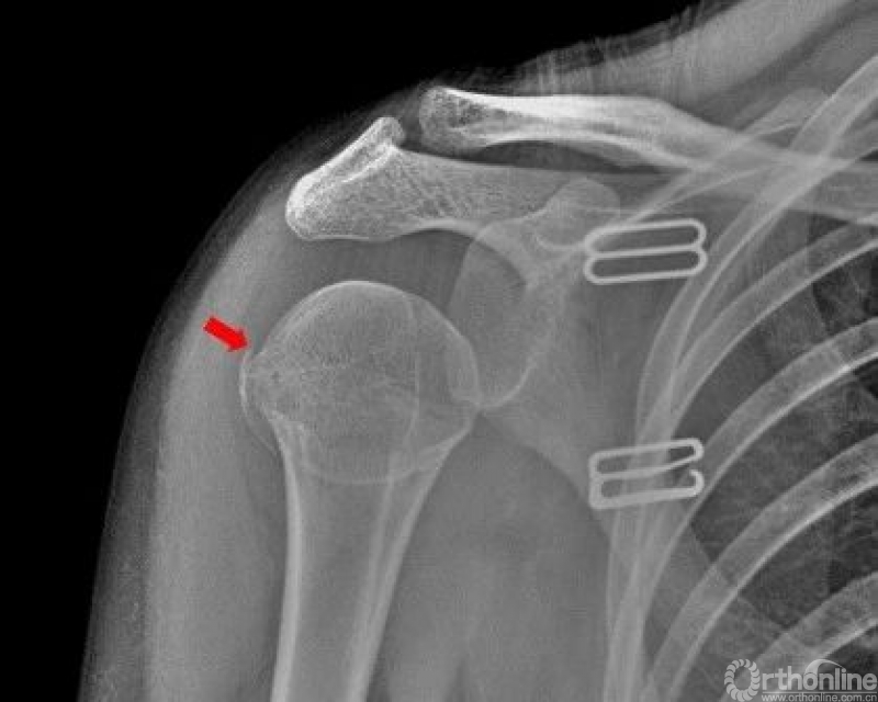 右侧肱骨大结节骨皮质欠光整,见弧形透亮线。右侧肱骨大结节骨折