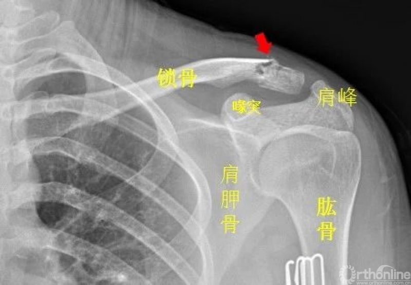 左侧锁骨肩峰端见不规则透亮线,骨折处稍移位。左侧锁骨骨折