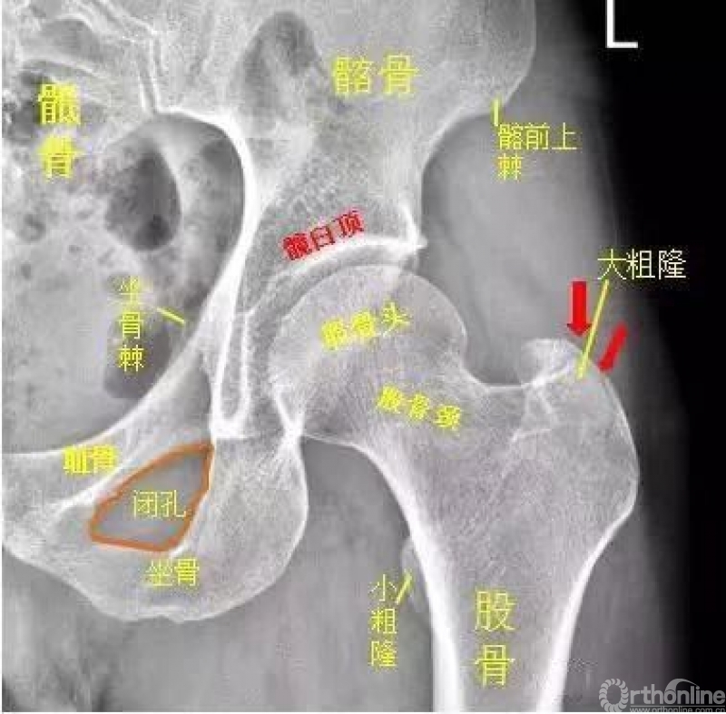 左侧股骨大粗隆处见不规则透亮线影,骨折处无明显分离、移位。左侧股骨大粗隆骨折