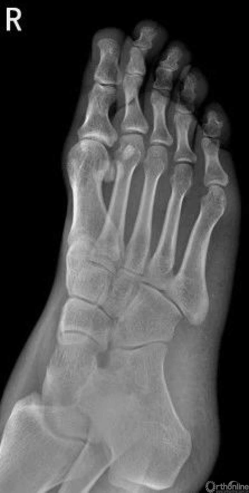 右足第5跖骨基底部见骨折线,断处稍分离移位。右足第5跖骨基底部骨折