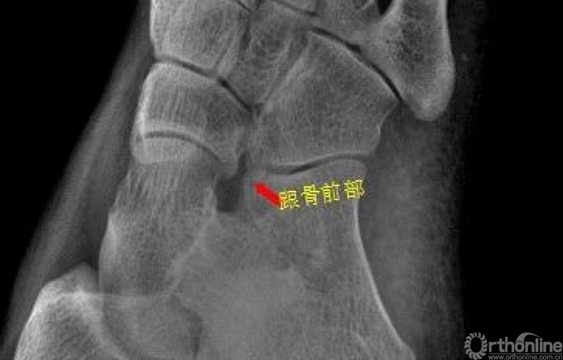 右足斜位示 右侧跟骨前部见骨折透亮线。右跟骨前部骨折