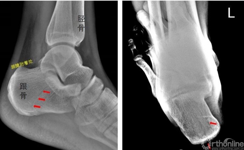 左侧跟骨见骨折透亮线,后缘骨皮质连续中断。左侧跟骨骨折