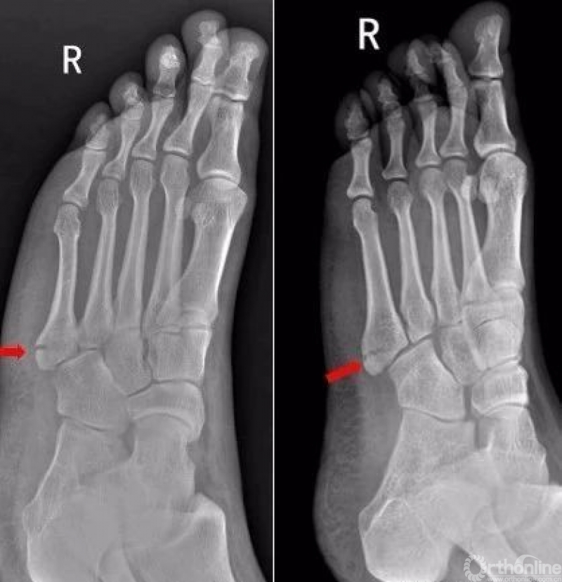 Warmreminder: 儿童时期足第5跖骨处有骨骺存在,骨骺线易与骨折线混淆,小妙招给你,骨骺线的长轴一般是与第5跖骨长轴平行,而第5跖骨多是横行骨折,换言之骨折线与第五跖骨长轴垂直。