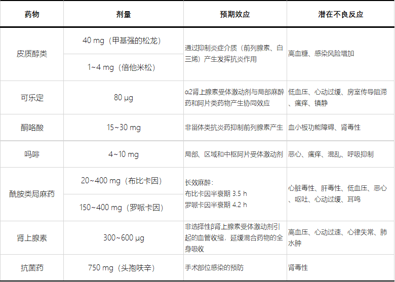 关节腔周围注射是TKA术后常用的镇痛方式之一,该方法操作简单,可避免神经阻滞的潜在并发症。术中关节腔周围注射时常采用多种药物组成的混合物,俗称“鸡尾酒”,其组成通常包括长效麻醉药物、非甾体类抗炎药和肾上腺素等,主要注射部位包括膝关节后囊、侧副韧带、关节囊切口处、股四头肌和皮下软组织等。不同种类药物及不同的药物剂量可以组合成多种“鸡尾酒”配方,但目前尚难以评判何种配方最为有有效。