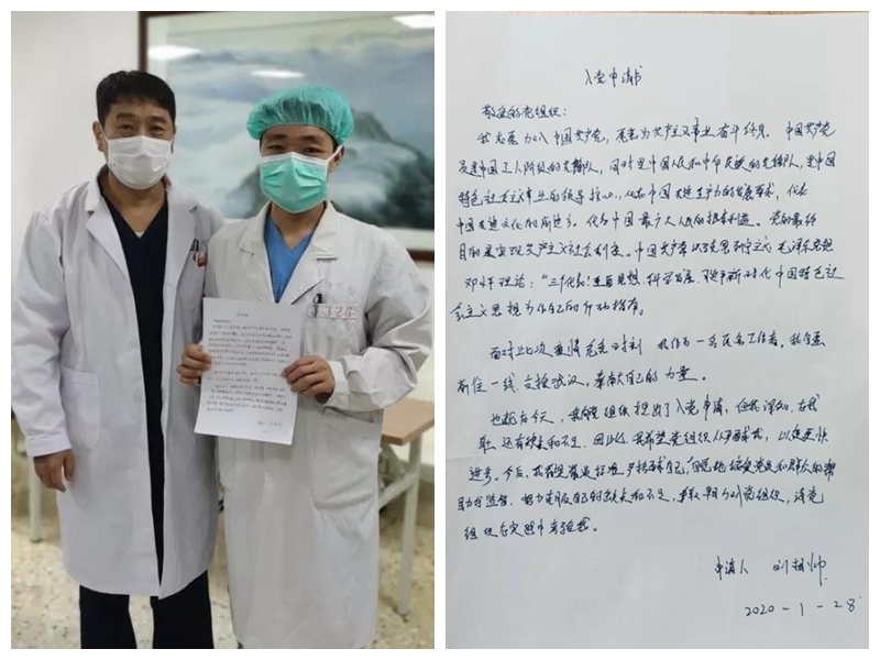 刘相帅在出征前,向马信龙书记递交了自己的入党申请书。他表示:“面对此次疫情危急时刻,我作为一名医务工作者,我自愿前往一线,支援武汉,奉献自己的力量”。