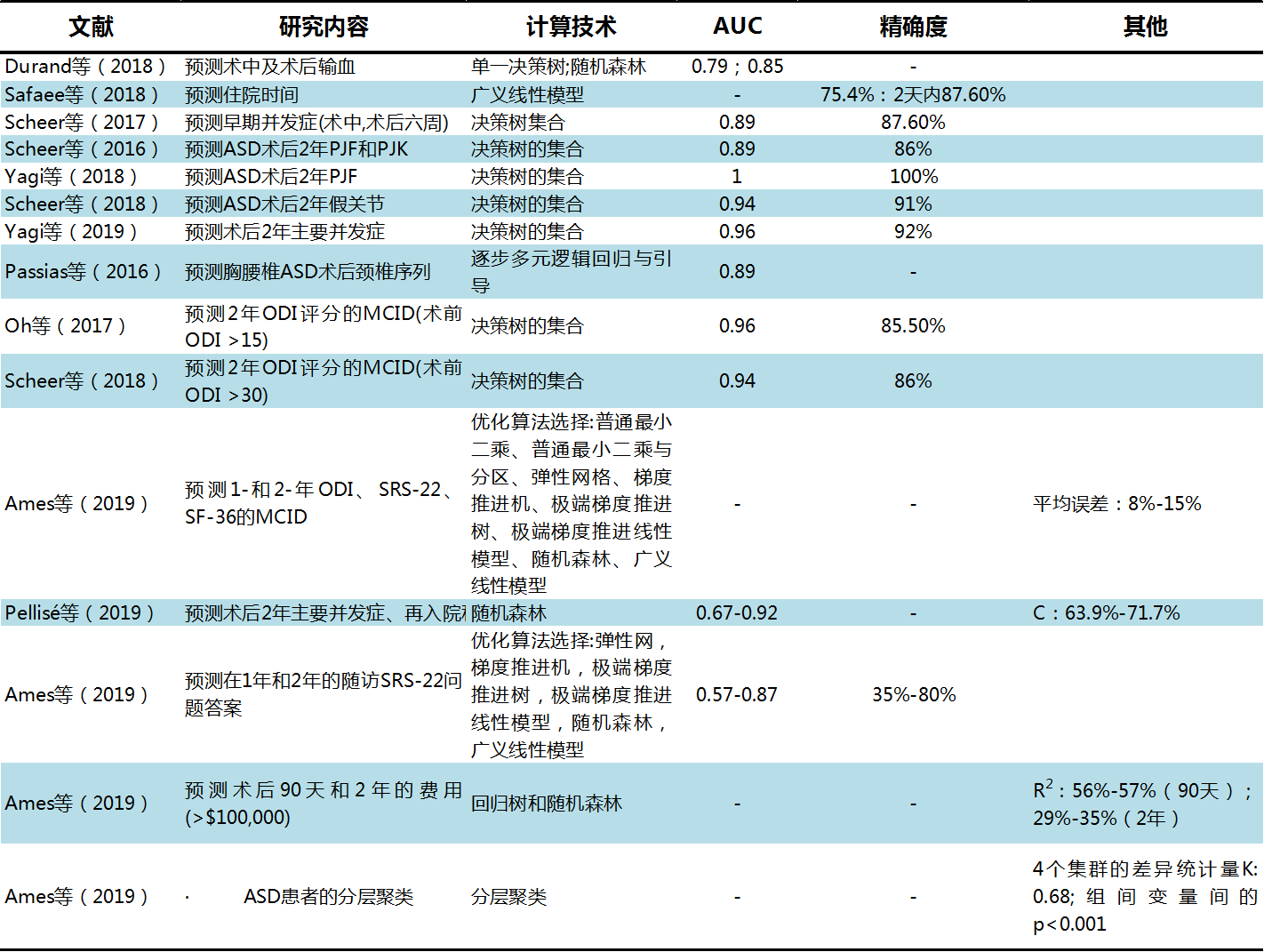 建立在机器学习算法上的ASD预测分析近年来取得了明显进步,结果有助于医生和患者进行更全面的术前讨论、手术决策与沟通。ASD预测分析内容包括预测术中、围手术期、术后并发症和研究成果。