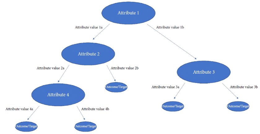 图2. 描述决策树分类器的示意图,以及如何迭代形成树结构来预测期望输出。在该图中,属性表示临床变量,箭头所示的属性值对应于给定属性/临床变量的不同观察值。最终结果/目标是期望的变量或预测(即并发症是/否)