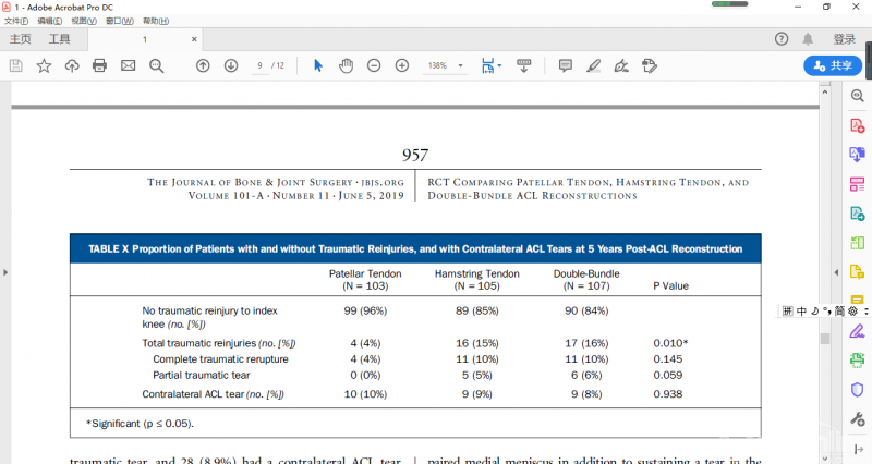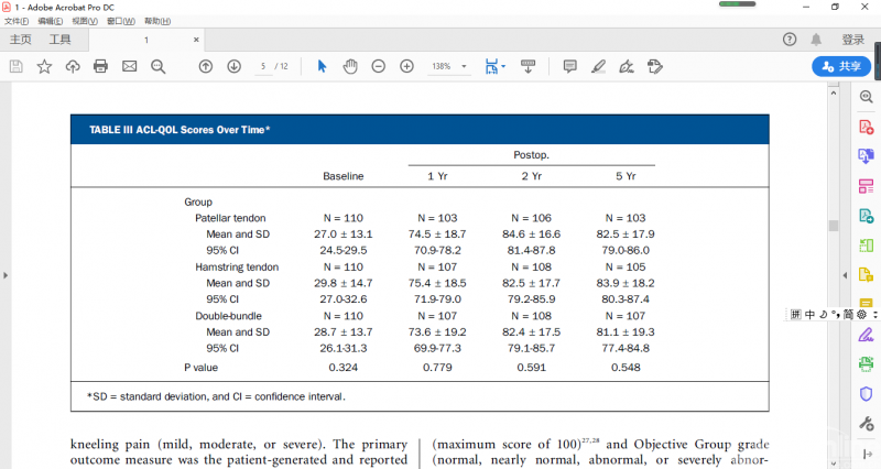 然而,与BTB组(4%)相比,腘绳肌腱单束组(15%)和腘绳肌腱双束组(16%)的外伤导致移植物再损伤率显著增高(近4倍)。与预期一样,采用BTB组(10%)患者的膝痛或膝前痛的发生率与腘绳肌腱单束组(4%)和双束组(2%)相比显著增加。