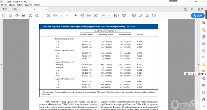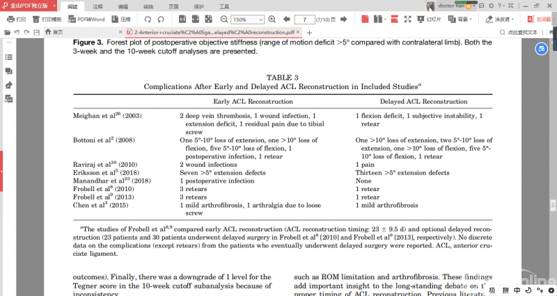 作者发现不同手术时间在术后活动度丢失、关节纤维化、再断率和关节松弛等方面没有显著差异。需要注意的是本文纳入的8项研究在术前活动范围、移植物选择、康复方案等方面存在高度异质性,并且纳入研究的证据等级较低,所以其最终结论尚存疑问,仍需要进一步研究。