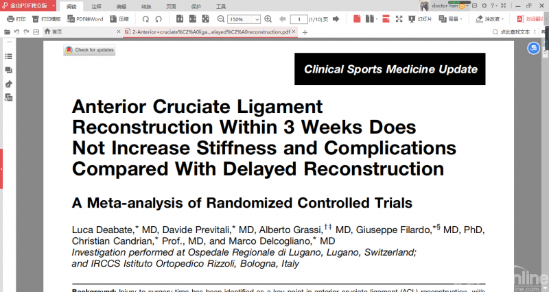 美国运动医学杂志发表的一篇系统综述和Meta分析,主要比较早期ACL重建(受伤3周内)是否比延迟ACL重建(受伤10周以上)导致更多的并发症,尤其是关节僵硬和关节纤维化等。文章纳入了8项随机对照研究,共计505例患者,平均年龄为28岁,男女比例为2.4:1,两组患者数量大致相等(270例为早期重建,235例为延迟重建)。