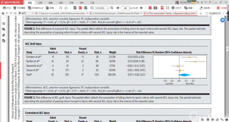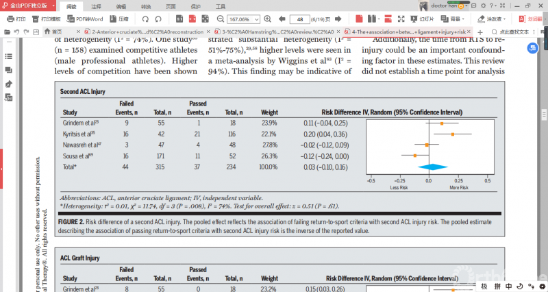 Justin等发表的一篇系统综述和meta分析了成功进行ACL重建的患者术后是否可以依据基于运动测试的公认标准来降低ACL二次损伤的风险,共有4项研究符合纳入标准,提取纳入研究的回归运动测试数据(等速测试和单足跳测试等)。