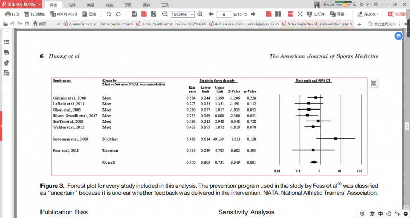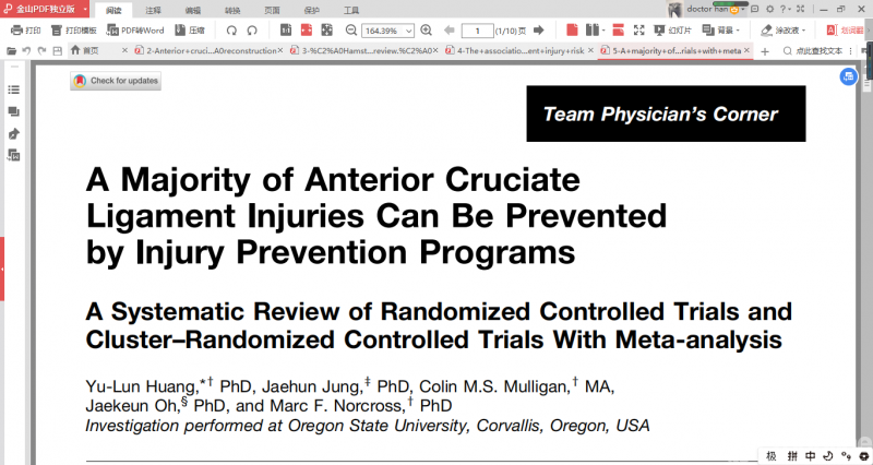 结果显示ACL 损伤预防计划(IPPs)具有显著的保护作用,损伤率降低了53%。虽然已经有一些关于这个主题的系统综述,但这项研究是迄今为止最清晰的分析之一,研究只纳入了随机对照研究,并解决了纳入研究的聚类效应偏差。