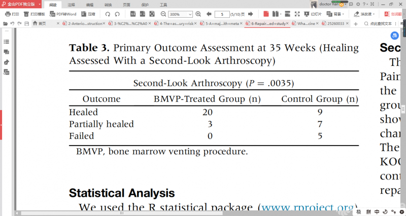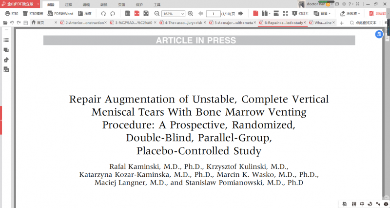 促进半月板修复后愈合是一个非常有趣的领域,在波兰进行了一项高质量的随机对照研究(RCT),共纳入40例患者,其中20例患者(21处半月板损伤)单独进行了半月板修复术,另外20例患者(23处半月板损伤)半月板修复术后进行了骨髓激发技术(BMVP)。