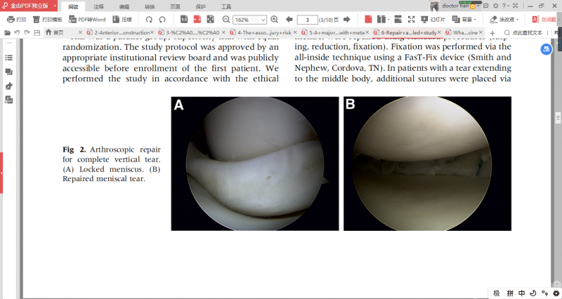 所有的撕裂都是完整的、不稳定红白区域的垂直撕裂(大部分桶柄撕裂),所有修复采用全内或者由内到外的垂直褥式的缝合方法。
