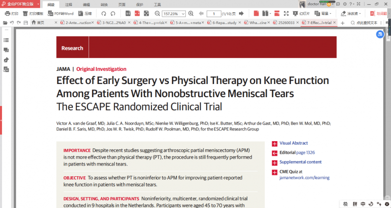 ESCAPE(Early Surgery Versus Conservative Therapy for Meniscal Injuries in Older Patients)研究小组进行了一项非劣效性、多中心、非盲性RCT研究,主要比较中老年半月板损伤早期手术与保守治疗的临床效果,患者年龄在45岁- 70岁之间,诊断为无膝关节绞索症状的半月板撕裂,患者骨性关节炎程度(Kellgren-Lawrence分级)0-3级,作者比较了物理治疗和关节镜下半月板部分切除术的临床效果。在这项研究中,对照组162名患者参与了为期8周的物理治疗(共16次,每次30分钟),手术组159名患者接受关节镜下半月板部分切除术,手术组患者在4周内完成手术,术后采用的家庭康复方案。物理治疗组共有47例(29%)患者因症状持续而转入手术治疗组。
