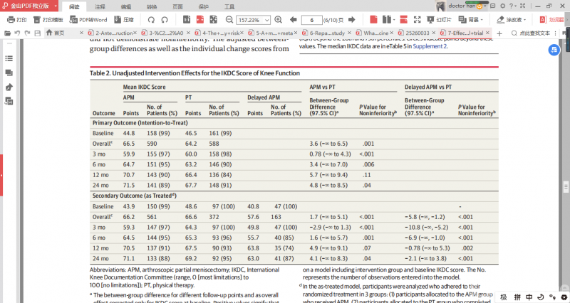 IKDC评分在关节镜下半月板部分切除术组中提高了26.2分,在物理治疗组中提高了20.4分。通过对24个月综合效应的初级混合模型分析发现,物理治疗效果不劣于关节镜下半月板部分切除术(p = 0.001)。