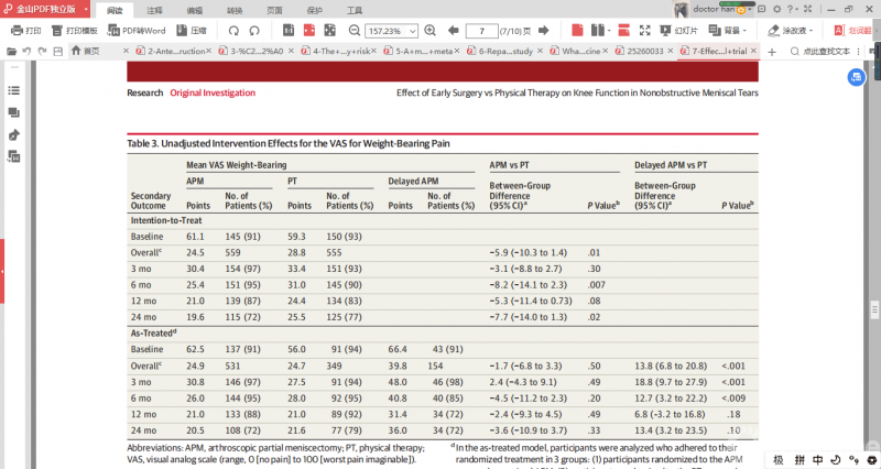 此外,与物理治疗组相比关节镜下半月板部分切除术更容易出现负重时疼痛,骨关节炎的影像学进展2组间无差异。事后探索性分析发现,与物理治疗相比,关节镜下半月板部分切除术更容易出现疼痛或肥胖增加。因此,ESCAPE研究组支持以下建议,即物理治疗可能被认为是替代关节镜下半月板部分切除术的首选治疗方法。